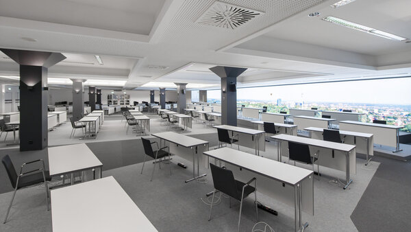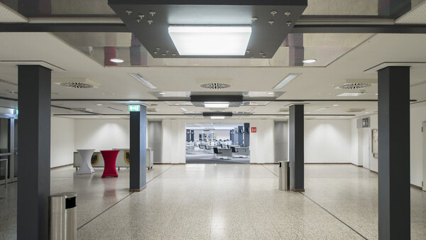 The room has WLAN, water, electricity and compressed air. There are no suspension points for technical installations.