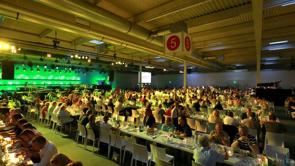 The floor load is 20.00 kN/m². Various gates are available: Gate 52 (4.00 × 3.90 m), Gate 53 (4.50 × 3.90 m) and Gate 54 (4.00 × 3.10 m). A catering facility called "Backstube" with an area of 210 m² and 40 seats is available.